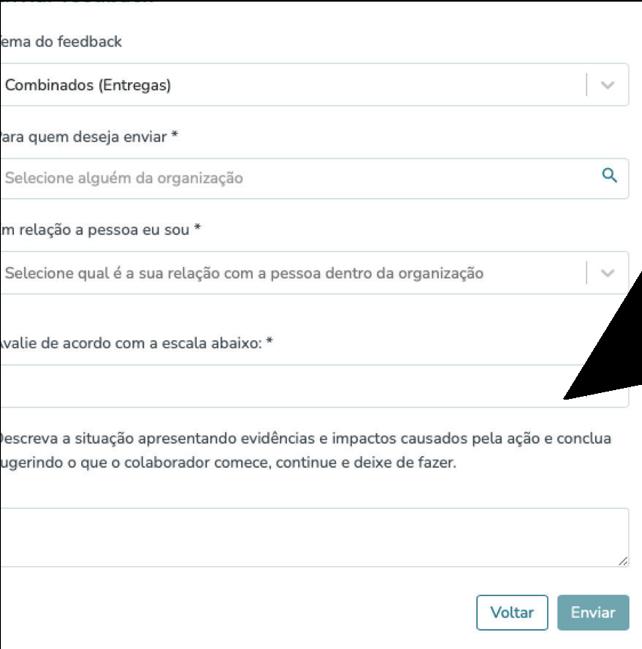 Digite o nome da pessoa que vai receber o feedback (caso tenha dúvidas, você poderá utilizar a lupa para pesquisar). É importante preencher todos os campos.