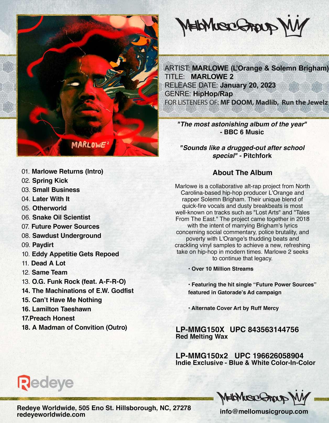 MARLOWE MARLOWE 2 MELLO MUSIC GROUP NOSAJ THING | J. ROCC | ELLIOTT SMITH RELEASE DATES: 1.20.23/1.27.23 | ORDERS DUE BY 12.30.22/1.06.23 CONNECT WITH US: @RedeyeWorldwide Redeye Worldwide