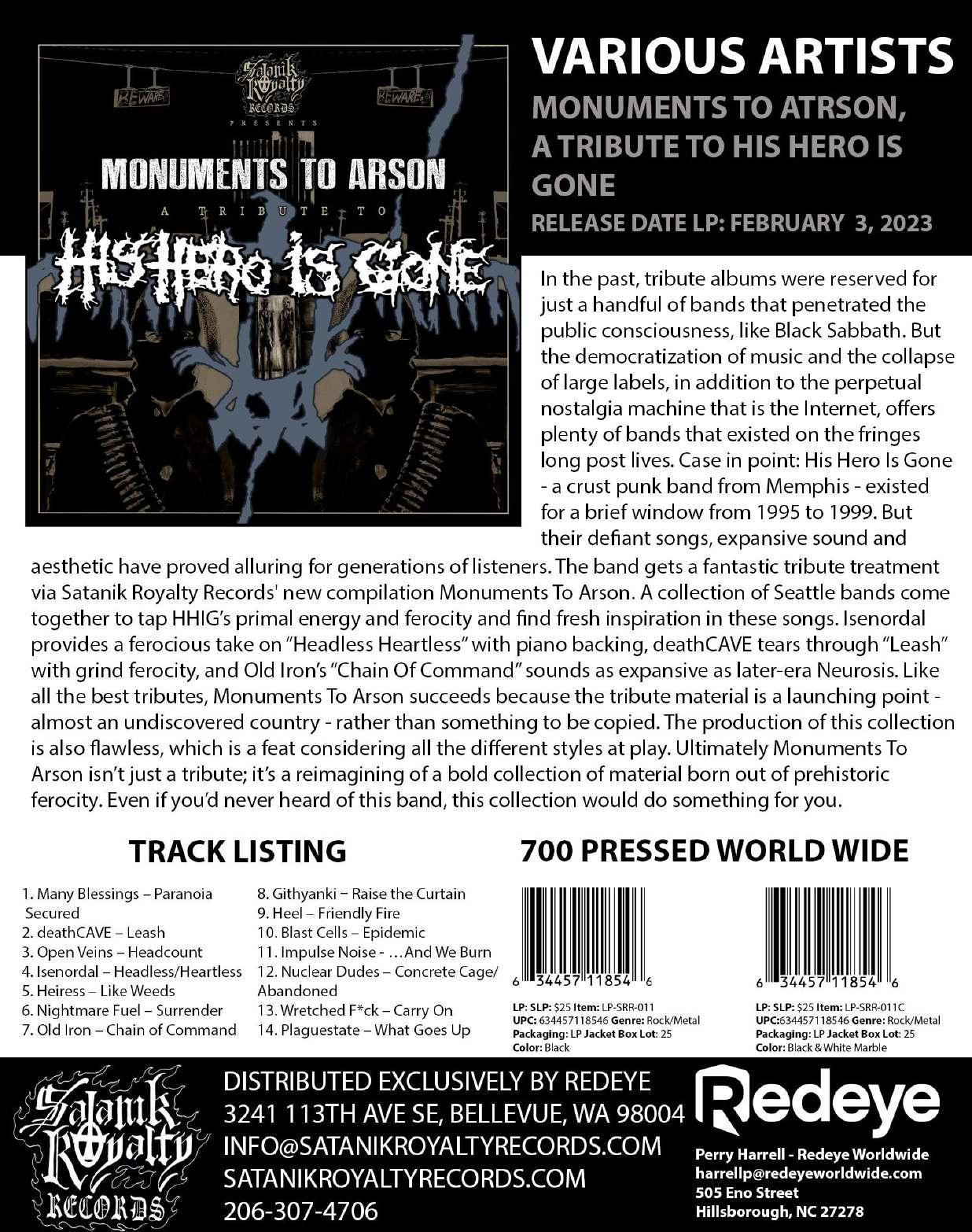 634457108448 LP-SRR-011LE Various Artists Monuments To Arson, A Tribute To His Hero Is Gone Vinyl $16.65 $24.99 634457108455 LP-SRR-011LEC Various Artists Monuments To Arson: A Tribute To His Hero Is Gone (BLACK AND WHITE MARBLE VINYL)