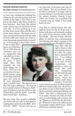 one than this: to lay down one’s life for one’s friends. You are my friends if you do what I command. I no longer call you servants, because a servant does not know his master’s business. Instead, I have called you friends, for everything that I learned from my Father I have made known to you.” Aunt Faye is a friend of Jesus who willingly lay down her life for Susie, now in heaven with Jesus, and anxiously awaiting the arrival of her precious mother, Nora Faye Smith. The two of them will have plenty of catch-up time communicating and enjoying each other’s company in the most wonderful ways throughout eternity. Aunt Faye will feel right at home in that environment, because it is after all, a place that is saturated with love. I am looking forward to getting in on some of those conversations and getting to know my cousin who could only communicate on this earth through her eyes, smiles or frowns, which her mother could always interpret. I can’t wait to get to know you Susie in all the capacity that God created within you. As for me, I was always in awe of Aunt Faye’s incredible love and the bond between Mother and Child. Aunt Faye is embarrassed if you try to make a heroine out of her, but how can I not acknowledge such a woman and say “Thank you, Aunt Faye, for the example. Whenever I want to be lifted up and encouraged, I always think of you. And I will love you and Susie forever.” may 2016