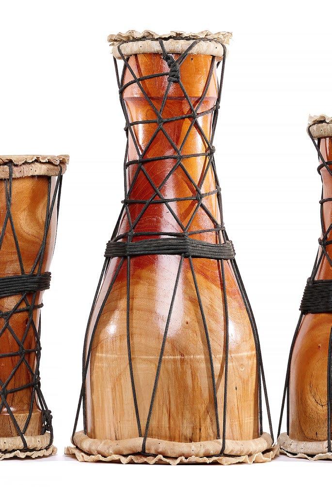 These traditional Afro-Cuban drums, crafted from ethically sourced Spanish Cedar, come in the three sizes of Iya, Itotele, and Okonkolo. Each drum features durable 5mm rope and Argentinian cowhide for a rich and authentic sound.