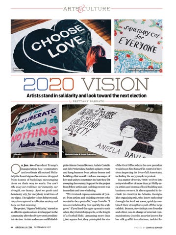n Jan. 20—President Trump’s inauguration day—commuters and residents all around Philadelphia found signs of resistance dropped from dozens of buildings encouraging them on their way to work: You can’t take away our resilience, our humanity, our strength, our beauty. Aquí me quedo and Sanctuary city for everybody read two of the signs. Though the voices felt personal, they also captured a collective anxiety and hope on that morning. The project, “Signs of Solidarity,” started as an effort to speak out and lend support to the community after the divisive 2016 presidential election. Artists and concerned Philadel44