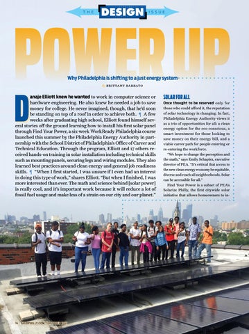 SOLAR FOR ALL Once thought to be reserved only for those who could afford it, the reputation of solar technology is changing. In fact, Philadelphia Energy Authority views it as a trio of opportunities for all: a clean energy option for the eco-conscious, a smart investment for those looking to save money on their energy bill, and a viable career path for people entering or re-entering the workforce. “We hope to change the perception and the math,” says Emily Schapira, executive director of PEA. “It’s critical that access to the new clean energy economy be equitable, diverse and reach all neighborhoods. Solar can be accessible for all.” Find Your Power is a subset of PEA’s Solarize Philly, the first citywide solar initiative that allows homeowners to in-