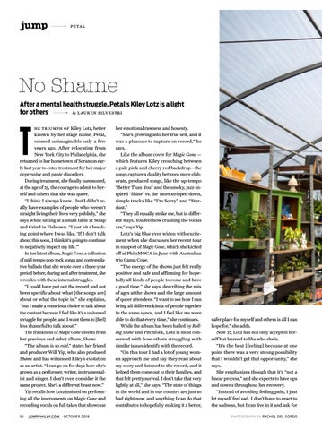he triumph of Kiley Lotz, better known by her stage name, Petal, seemed unimaginable only a few years ago. After relocating from New York City to Philadelphia, she returned to her hometown of Scranton early last year to enter treatment for her major depressive and panic disorders. During treatment, she finally summoned, at the age of 25, the courage to admit to herself and others that she was queer. “I think I always knew… but I didn’t really have examples of people who weren’t straight living their lives very publicly,” she says while sitting at a small table at Steap and Grind in Fishtown. “I just hit a breaking point where I was like, ‘If I don’t talk about this soon, I think it’s going to continue to negatively impact my life.’” In her latest album, Magic Gone, a collection of mid-tempo pop-rock songs and contemplative ballads that she wrote over a three-year period before, during and after treatment, she wrestles with these internal struggles. “I could have put out the record and not been specific about what [the songs are] about or what the topic is,” she explains, “but I made a conscious choice to talk about the content because I feel like it’s a universal struggle for people, and I want them to [feel] less shameful to talk about.” The frankness of Magic Gone diverts from her previous and debut album, Shame. “The album is so real,” states her friend and producer Will Yip, who also produced Shame and has witnessed Kiley’s evolution as an artist. “I can go on for days how she’s grown as a performer, writer, instrumentalist and singer. I don’t even consider it the same project. She’s a different beast now.” Yip recalls how Lotz insisted on performing all the instruments on Magic Gone and recording vocals on full takes that showcase 54