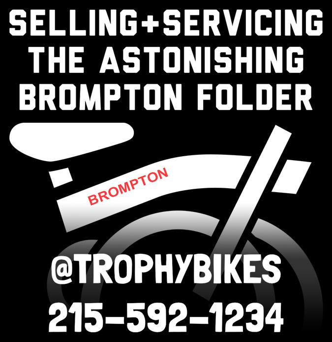 We specialize in the ingenious Brompton Bicycle, made & designed in London to save you time — and space — with its fast, compact fold. Open Wed-Sat, 12-6 pm at 133 S. 23rd St. On the Web @trophybikes