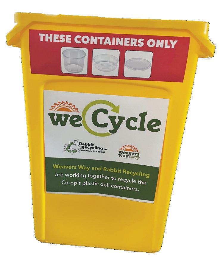 Our WeCycle program takes back single-use plastic containers from our Deli and Prepared Foods departments and sends them to Rabbit Recycling, a recovery facility that will ensure they are recycled or reused properly. By partnering with Rabbit Recycling, we will divert in-house plastic packaging toward more sustainable waste streams. Please bring in clean Weavers Way Deli and Prepared Foods containers ONLY and drop them into the yellow weCycle bins located in each store.