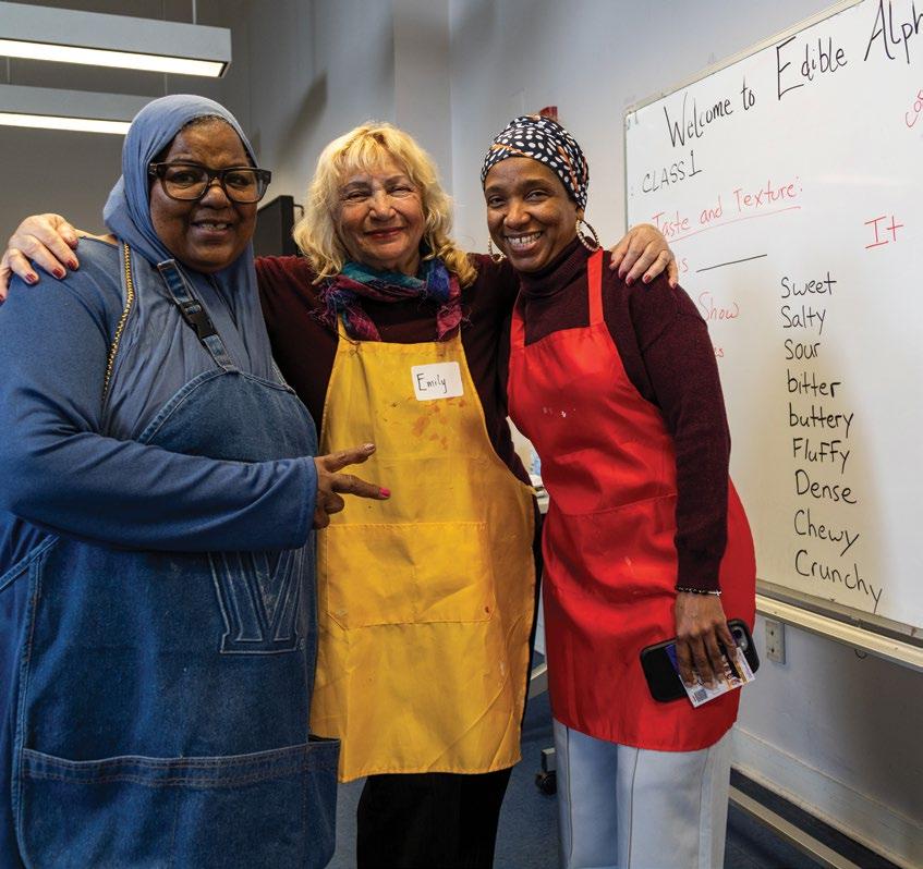 Southworth describes Edible Alphabet’s multiple goals. The first two are increasing conversational competence in English and introducing students to the many services the library system offers. She notes that some program participants have become library ambassadors and employees. Feedback from students attests to Edible Alphabet’s achievement of its third goal: building community. Students describe how the classes helped them feel less isolated and more connected to other new Americans and gave them increased confidence in their speaking skills. “I want to learn how to have a normal conversation, not just classroom English,” one Mandarin-speaking student says. “Cooking is a lifestyle activity, so it’s a good way to practice just talking.”