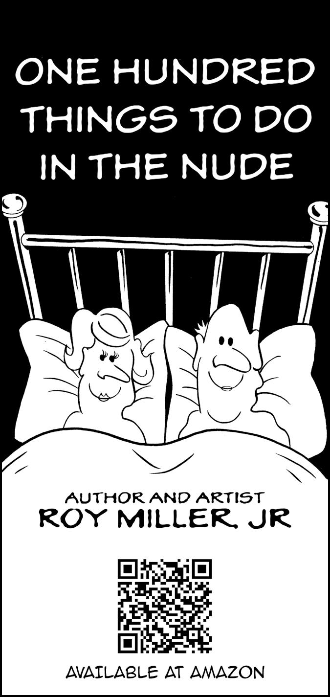 In this novelty cartoon collection, veteran illustrator and cartoonist Roy Miller Jr. suggests 100 fun and frivolous things for you to do. In the nude. Available on Amazon. tinyurl.com/NudeCartoonBook