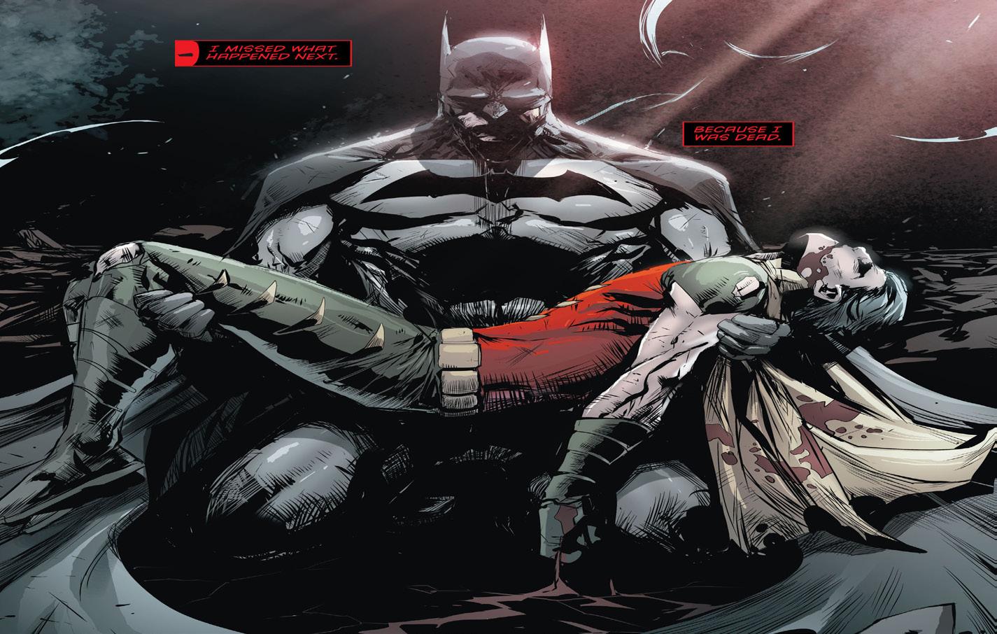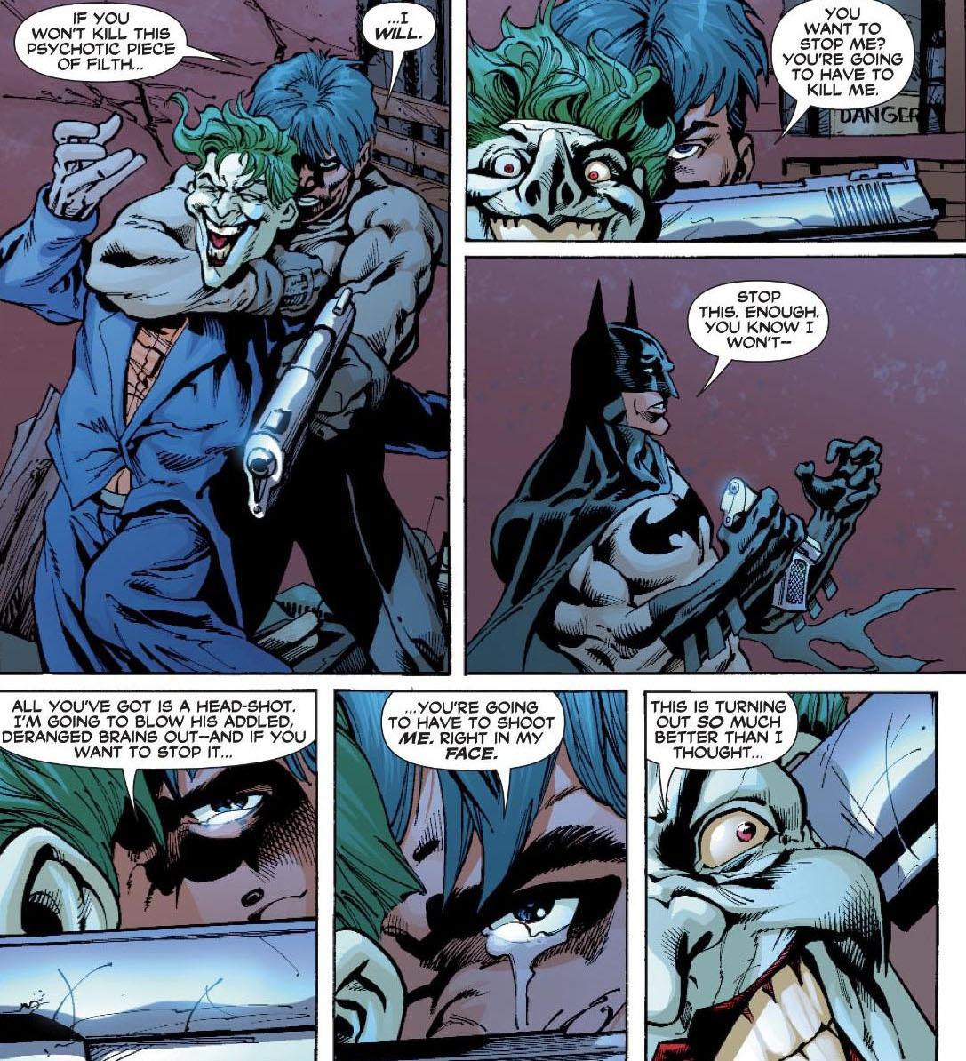 Jason returned by holding the Joker hostage, aiming to lure Batman into Crime Alley. The plan worked, and Jason asked why Batman had never avenged Jason’s death, nor Batgirl, who had been crippled by the Joker after Jason’s death. Batman offered his own point of view about how killing the Joker would be easy, but he refused to walk that path. Jason, undeterred, said unless Batman killed Jason, he would kill the Joker. Jason held the Joker at gunpoint and counted to three. At the last second, Batman threw a batarang that sliced Jason’s neck, which the Joker took advantage of, escaping and detonating explosives set on the platform they were standing on.