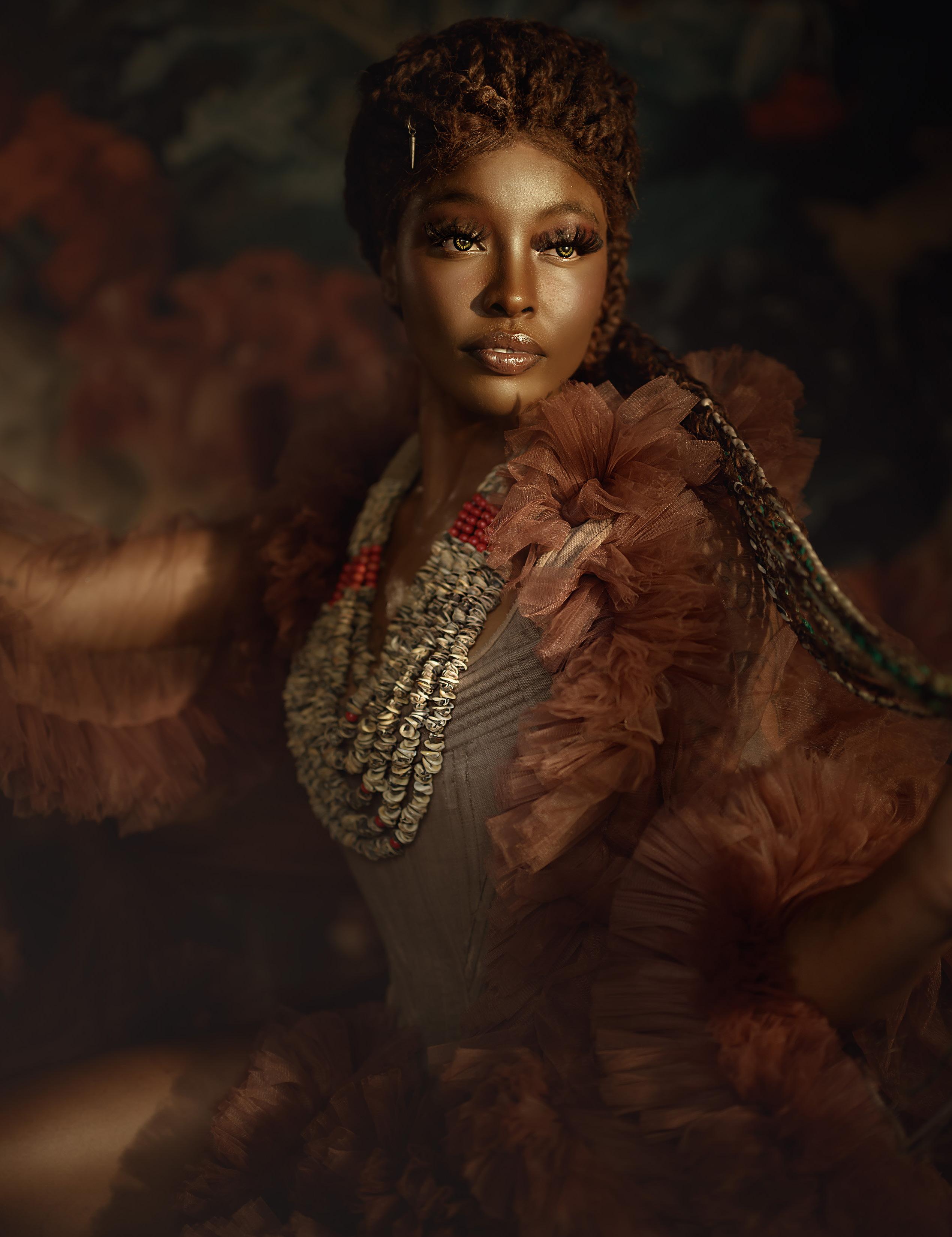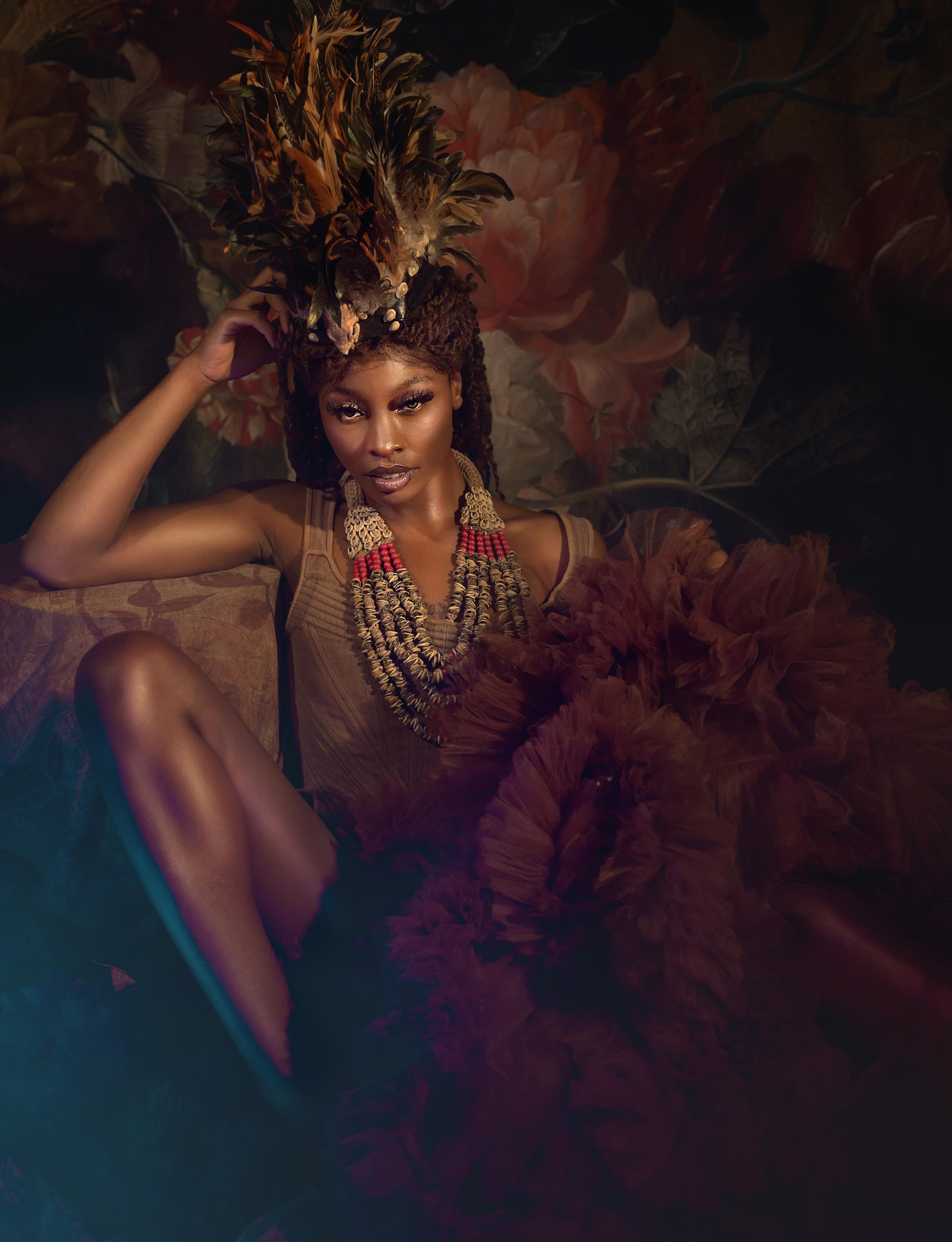 ear readers, Welcome to the July issue of Red Hot Monde Magazine, where fashion meets art in the most enchanting of ways. This month, we are thrilled to present an editorial that transcends the ordinary, blending the timeless elegance of Old Masters portraits with the unbridled creativity of contemporary fashion. Our latest shoot is a visual narrative that is both haunting and captivating. By merging the stately grace of classic portraiture with modern-day whimsy, we've created something truly extraordinary. The feather headpiece by the talented Brianna Leigh serves as a whimsical counterpoint to the traditional setup, adding an element of surrealism. Imagine a bird of paradise having alighted on the head of a duchess—it’s a sight that is as intriguing as it is beautiful.