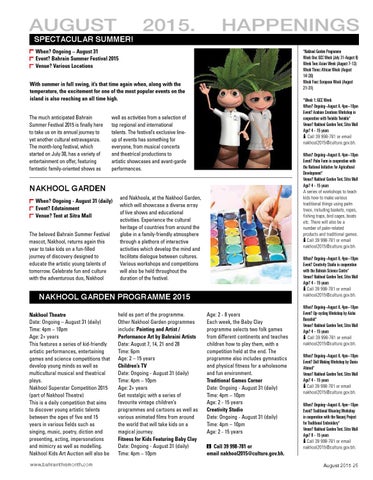 When? Ongoing–August 6, 4pm–10pm Event? Up-cycling Workshop by Aisha Burashid* Venue? Nakhool Garden Tent, Sitra Mall Age? 4 - 15 years E Call 39 998-781 or email nakhool2015@culture.gov.bh. When? Ongoing–August 6, 4pm–10pm Event? Doll Making Workshop by Dunia Ahmed* Venue? Nakhool Garden Tent, Sitra Mall Age? 4 - 15 years E Call 39 998-781 or email nakhool2015@culture.gov.bh. When? Ongoing–August 6, 4pm–10pm Event? Traditional Weaving Workshop in cooperation with the Nasaej Project for Traditional Embroidery* Venue? Nakhool Garden Tent, Sitra Mall Age? 8 - 15 years E Call 39 998-781 or email nakhool2015@culture.gov.bh. August 2015 25