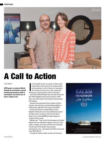 t’s impossible to pick up a paper or listen to the news without hearing stories of refugees killed as they attempt to sail to freedom or swamping host nations as they arrive in their thousands fleeing war and persecution in their homelands. June 20 was World Refugee Day and also the day the film Salam Neighbor had its world premiere at AFI Docs, one of the world’s most important documentary film festivals. Directed and produced by Chris Temple and Zach Ingrasci, who shone the uncomfortable spotlight on world poverty with their film Living on One Dollar. Produced by Bahrain resident Mohab, Salam Neighbor follows the pair as they deliberately head to the edge of war, just seven miles from the Syrian border, to live among 85,000 uprooted refugees in Jordan’s Za’atari camp. Mohab says: “They are the first filmmakers the United Nations has ever allowed to register and set up a tent inside a refugee camp. Zach and Chris were plunged into the heart of the world’s most pressing humanitarian crisis – described by the UN as ‘the worst since World War II’.” Through the rhythm of daily routines and moments www.bahrainthismonth.com