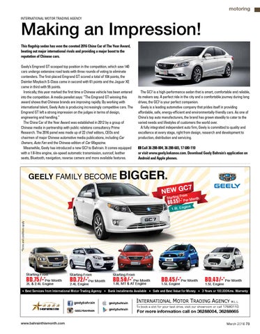 The GC7 is a high-performance sedan that is smart, comfortable and reliable, its makers say. A perfect ride in the city and a comfortable journey during long drives, the GC7 is your perfect companion. Geely is a leading automotive company that prides itself in providing affordable, safe, energy-efficient and environmentally-friendly cars. As one of China’s top auto manufacturers, the brand has grown steadily to cater to the varied needs and lifestyles of customers the world over. A fully integrated independent auto firm, Geely is committed to quality and excellence at every stage, right from design, research and development to production, distribution and servicing. Call 36 288-004, 36 288-665, 17 680-110 or visit www.geely.kekanoo.com. Download Geely Bahrain’s application on Android and Apple phones.