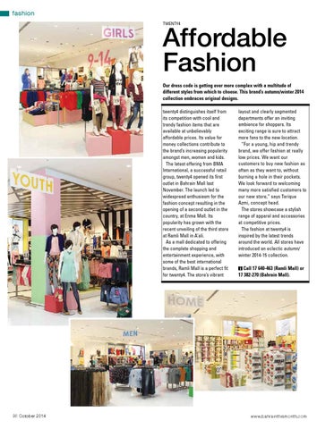 layout and clearly segmented departments offer an inviting ambience for shoppers. Its exciting range is sure to attract more fans to the new location. “For a young, hip and trendy brand, we offer fashion at really low prices. We want our customers to buy new fashion as often as they want to, without burning a hole in their pockets. We look forward to welcoming many more satisfied customers to our new store,” says Tarique Azmi, concept head. The stores showcase a stylish range of apparel and accessories at competitive prices. The fashion at twenty4 is inspired by the latest trends around the world. All stores have introduced an eclectic autumn/ winter 2014-15 collection. i Call 17 640-463 (Ramli Mall) or 17 382-270 (Bahrain Mall).