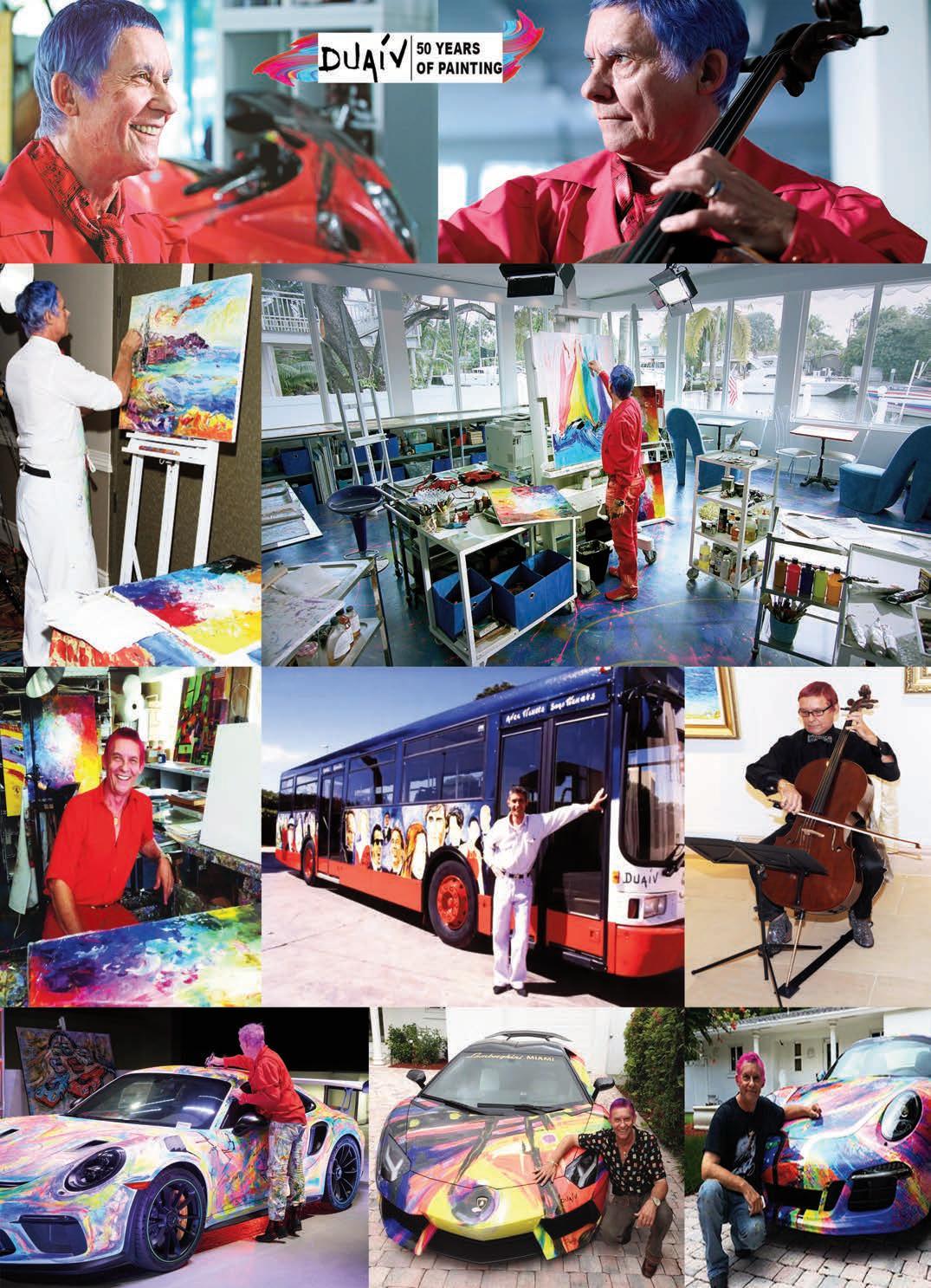 Red Ink Magazine had the absolute pleasure this past month to travel to Fort Lauderdale, Fl to view in person the studio in Duaiv’s home where the magic truly happens. Magella and Duaiv invited us into their home for a very candid interview and we were able to enjoy the visual spectacle that is Duaiv’s art studio. From the Formula One race car and Racing Motorcycle encased in Acrylic to the models of all the exotic sports cars that Duaiv has custom painted over the years, to the works of art spanning every inch of the studio, including his vast collection of painted instruments; cellos, violins, guitars, and so much more. We were truly in awe. A video that shows the entrance of Red Ink Owner and Publisher Naz Khan entering the studio can be viewed alongside this article, as can a video of Duiav applying paint to canvas on a private commissioned art work that has never been seen before, a true Red Ink Exclusive.