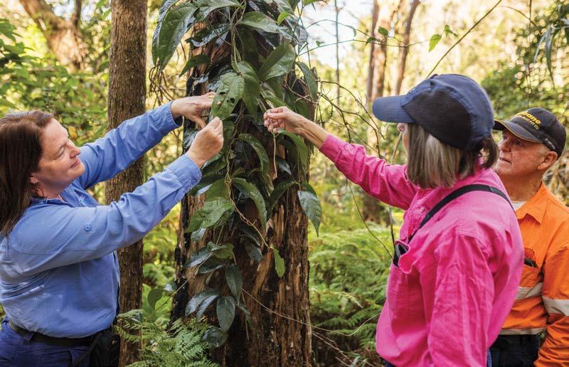 Property owners Jenny and Peter Spencer, with Council’s Senior Environmental Partnerships Officer Maree Manby, reviewing the progress of the Richmond birdwing butterfly vines planted through Land for Wildlife.