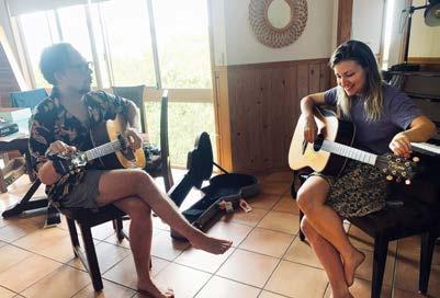 Kate Miller-Heidke takes a selfie on the beach on Minjerribah, and (inset) jamming with husband Keir Nuttall during their Dunwich getaway.