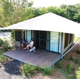 The fabulous (powered) safari-style glamping tents boast timber floors with double bed, and a deck with water views and designer hammock.