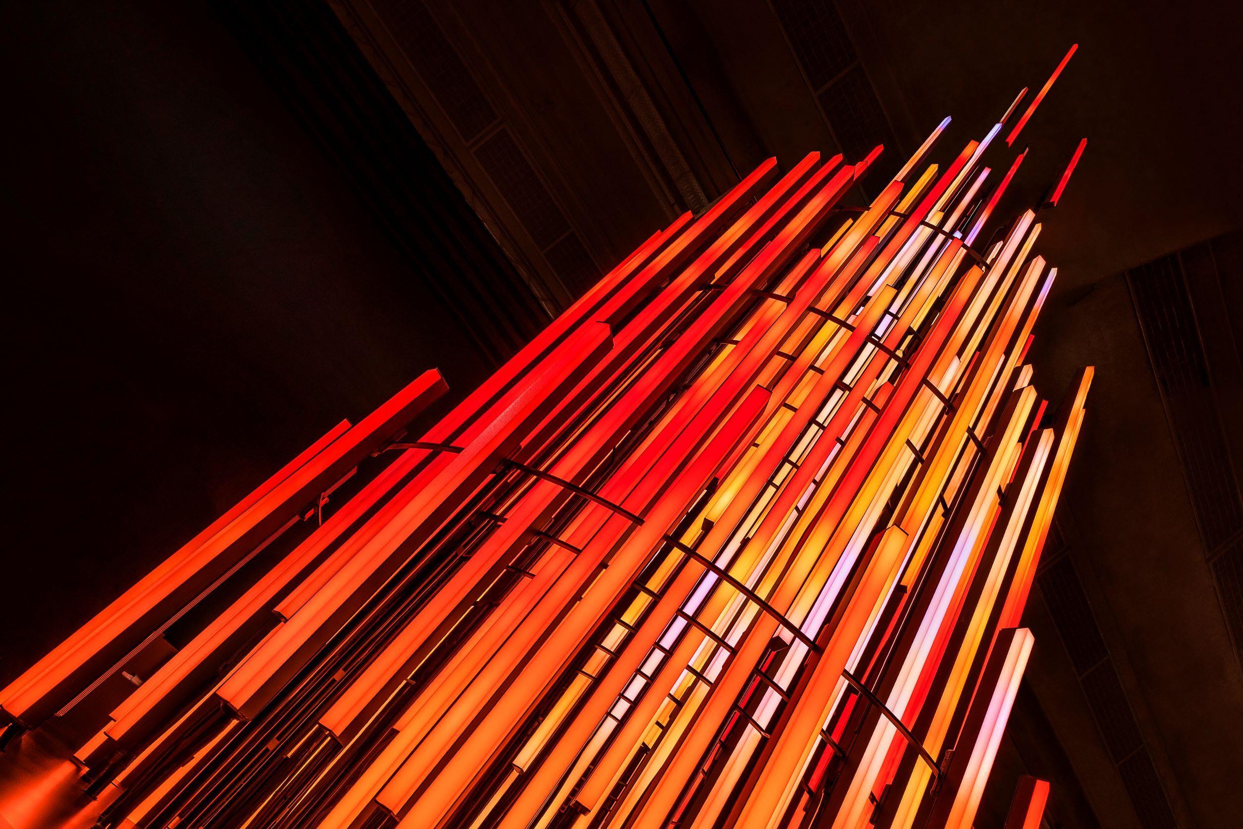 Like a chameleon, GRID continuously adopts new forms and colors.At times the installation appears weightless, as a flying carpet is woven from threads of light At others, it becomes an alien vessel, threatening to dive and engulf the audience, only to dissolve into a crackling cloud shortly after.GRID is enduring and fleeting simultaneously, an endless transformation of dreamlike sequences