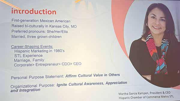 del Área Metropolitana de St. Louis, y Jeff Wade, director ejecutivo de la Cámara de Comercio Asiático-Americana de St. Louis. La presentación de Martha García Kampen recibió aplausos por su claridad y profundidad, y mostró datos concisos sobre el crecimiento, los desafíos y las aportaciones de la comunidad hispana a la economía de EE.UU.