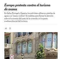 Las pistolas de agua volvieron a las calles de Barcelona el domingo, cuando miles de personas se reunieron para protestar contra el turismo de masas en ciudades de todo el sur de Europa. En Génova, Italia, los manifestantes hicieron rodar maletas por las estrechas calles adoquinadas del centro de la ciudad, como parte de lo que llamaron un “paseo ruidoso”. En Lisboa, los manifestantes llevaron una efigie hecha a mano del santo patrón de la ciudad desde su iglesia homónima hasta el emplazamiento de un futuro hotel de cinco estrellas. Y en la isla española de Mallorca, los habitantes detuvieron el sábado un autobús turístico de dos pisos, encendieron bengalas y le colgaron una pancarta.
