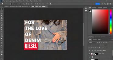 The first thing i did when editing my photos was fill the whole page with the pictures. From the very start i knew that my pictures would have the red Diesel boxed logo in one of the corners as this is something that Diesel as a brand does across all of thier ads, i just wasnt sure which corner, so i tried it out in different places on my different photos. I also kept adjusting the size of it to make sure that it fit in well and didnt look out of place. Next i started on the typography on my ad campaigns. I knew that the quote would be ‘For The Love Of Denim’, the title of my campaign, and i chose a font that matched the diesel logo. however, i wasnt sure about anything else to do with it. i didnt know where i would place it on the diffferent pictures, so i kept moving it about, changing the font size and the layout of the words and which rows they were in.