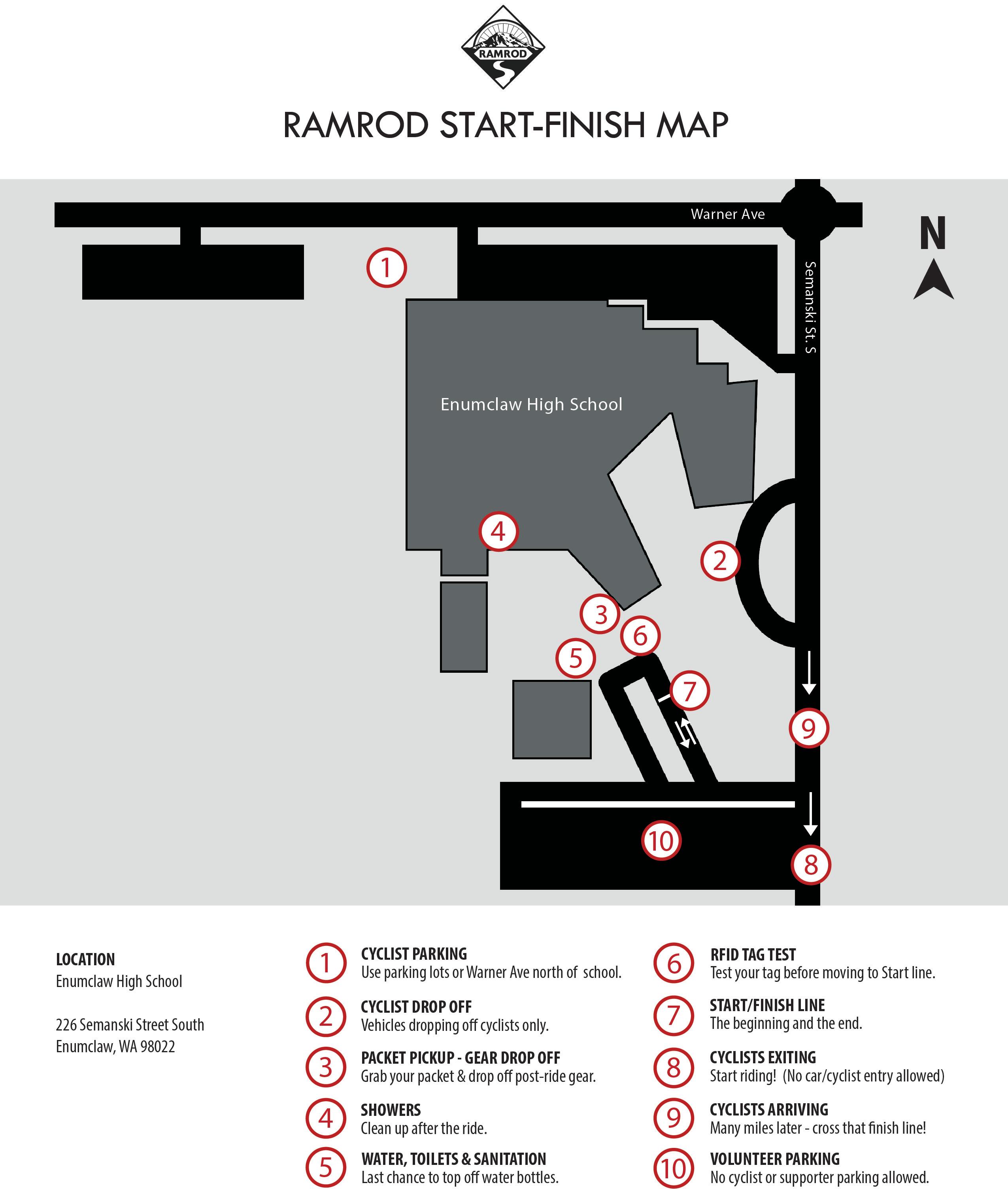 RAMROD 2023 begins and ends at the Enumclaw High School located at 226 Semanski Street South, Enumclaw, WA 98022. At the Start Line, you can pick up your rider packet, or drop-off a bag. When you return, you can enjoy an ice cream bar, take a shower and talk with riders and volunteers.
