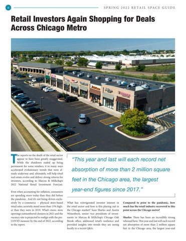 Compared to prior to the pandemic, how much has the retail industry recovered to this point across the Chicago metro? Sharko: There has been an incredibly strong rebound here. This year and last will each record net absorption of more than 2 million square feet in the Chicago area, the largest year-end
