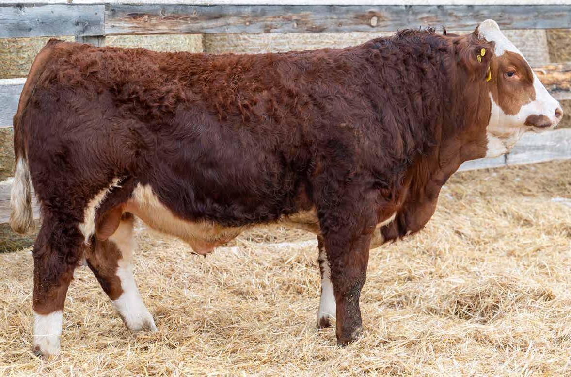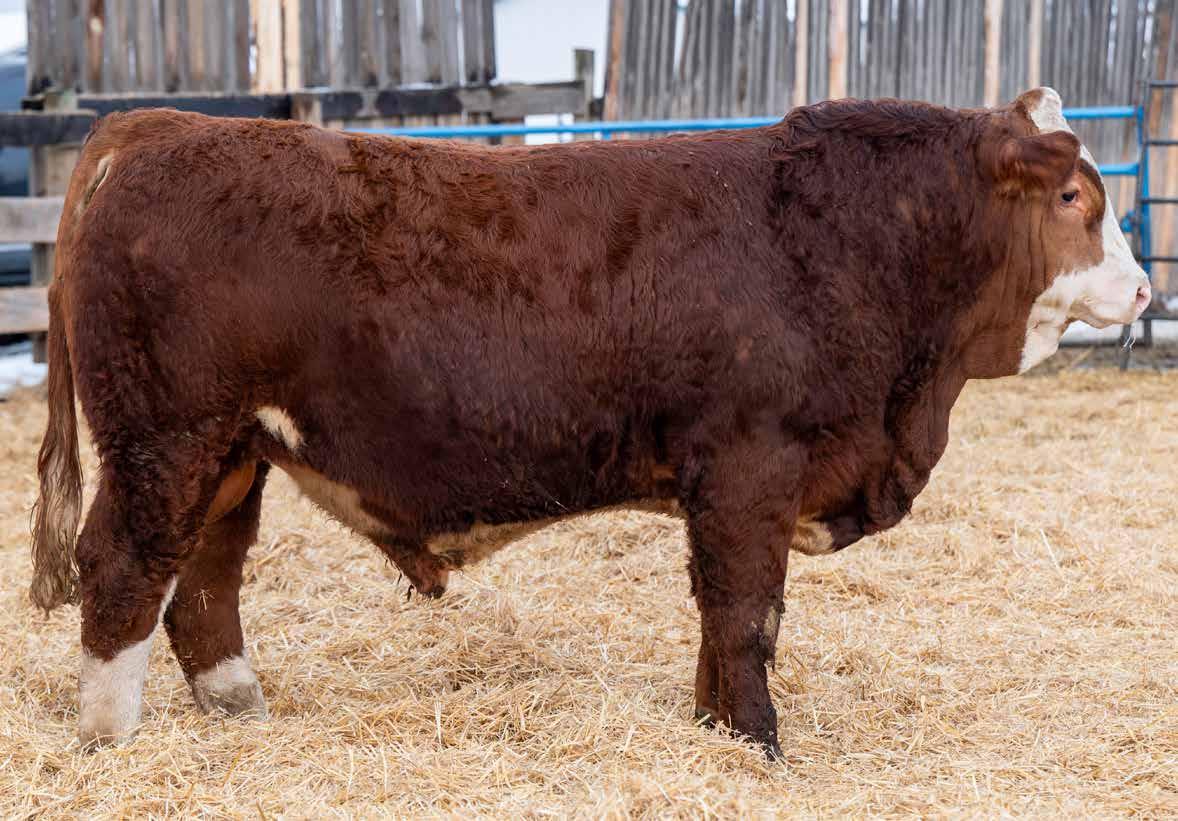 100% Full Fleckvieh: We seriously considered keeping Mystery for our own herd use. However we do already have 2 Elevation herd sires working so we made the decision to offer him for sale. His dam is an older cow so her calves’ birth weights are starting to creep up as we often see in our older cows. She’s been a very productive cow for us and we sold Mystery’s maternal sister through the Lone Stone sale last fall to Starwest Simmentals for $14000.00. If you’re looking for that dark red pigmentation and good growth and performance, Mystery is the bull. Check out his 2 year old brother and dam picture on Lot 38.