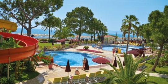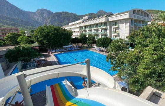 Vybavenie » priestranná vstupná hala s recepciou a posedením•hlavná hotelová reštaurácia•lobby bar s posedením a vonkajšou terasou•plážový bar•disco bar•3 a´la carte reštaurácie (talianska, rybia, turecká - 1x za pobyt zdarma, nutná rezervácia vopred)•2 snack bary•cukráreň•hlavný vonkajší bazén•detský bazén •vnútorný bazén s vyhradenou časťou pre deti•vonkajší bazén s 3 toboganmi•wellness centrum (masáže, peeling, kozmetika, manikúra za poplatok)•kaderníctvo• turecké kúpele a sauna (zdarma)•fitness centrum•nákupná pasáž•vodné pólo• disco•šipky•biliard (za poplatok)•stolný tenis•amfiteáter•detské ihrisko•plážové mólo s miestom na slnenie•široká ponuka vodných športov na pláži (za poplatok)• wifi v spoločných priestoroch•tématické večerné show•hotelové animácie Ubytovanie » príjemne zariadené 2-ložkové izby s možnosťou 1 prístelky •štandardné 2-lôžkové izby s 2 prístelkami v podobe poschodovej postele• klimatizácia•SAT TV•telefón•minibar (pri príchode naplnený nealko nápojmi, denne dopĺňaný vodou)•trezor (zdarma) •rýchlovarná kanvica•vlastné hygienické príslušenstvo (kúpelňa so sprchou, resp. vaňou, WC a sušičom na vlasy)•balkón s posedením•wifi pripojenie (za poplatok) Stravovanie » formou all inclusive
