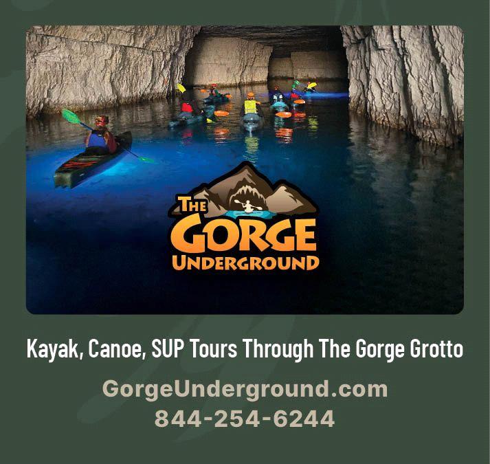 • Gorge Underground: A Unique Waterborne Family Adventure On The Water, Underground! Kayak and Pontoon Boat Tours 844-254-6244 Thegorgeunderground.com