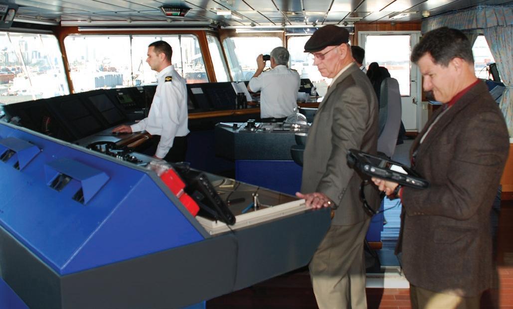 JPS has spearheaded developing Pilot navigation technology throughout its history. The presentday Portable Pilot Units (PPU) are handheld tablet computers that receive RTK GPS positioning and display a ship’s position icon, overlaid on a highresolution digital chart. With the PPU, the Pilot has the ship’s exact position in relation to the shoreline, piers, channels, underwater obstructions, and other vessels, either moving or docked. With the ship’s heading accurate to a fraction of a degree, Pilots can see where the ship is projected to move in the next minute, two minutes, and three minutes. With megaships now 1,300 feet long and containers stacked so high that they block the Pilot’s view of the channel, the PPUs are essential to safe navigation.