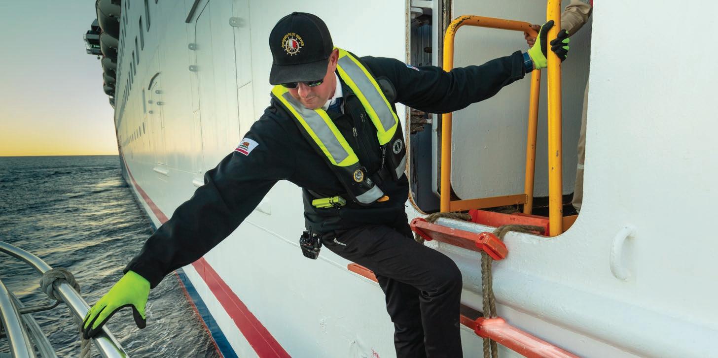 JPS Dispatch to request a Pilot. At the Pilot Station, the Dispatcher assigns one of the specialized, highspeed JPS Pilot Boats to take each Pilot out to meet their assigned vessel. Once that vessel is on course, the JPS Pilot Boat approaches. This is the critical moment. The Pilot goes up on deck and places the “Nav bag” on the platform. Then, once the Pilot Boat is directly alongside the ship and stable, the JPS Pilot carefully transitions to the ship’s ladder and begins the long climb. The Boat Operator is acutely aware of the inherent dangers of the Pilot’s climb and the Pilot Boat remains in place until the Pilot’s safe ascent is complete.