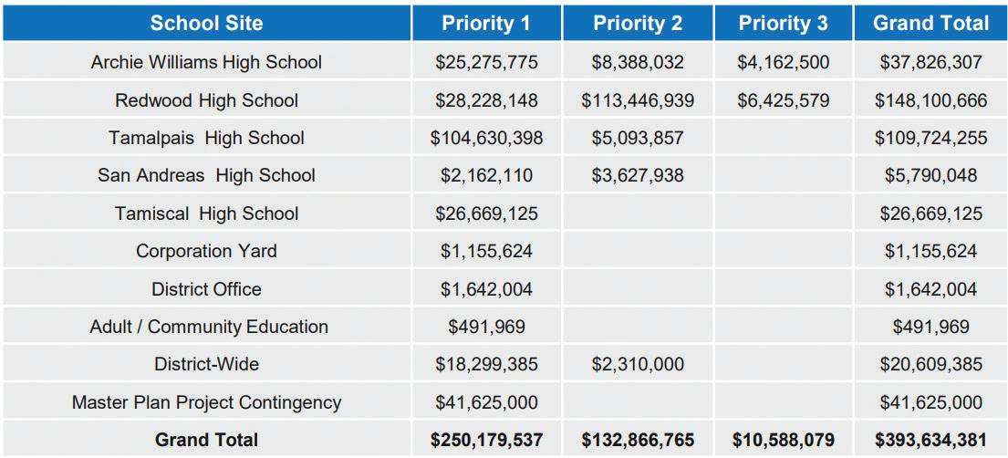 The TUHSD’s current facilities fundings of approximately $12 million does not cover the needs identified by the FMP. The upgrades for Redwood alone are estimated to cost $148 million. The districtwide project is anticipated to be $394 million in total. This amount includes an 11 percent buffer for unexpected additional future expenses such as inflation. Just the top priority projects would amount to approximately $250 million across the district and $28 million for Redwood. Elsen defended the large size of the project.