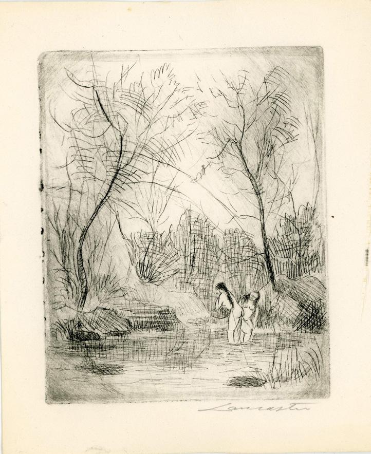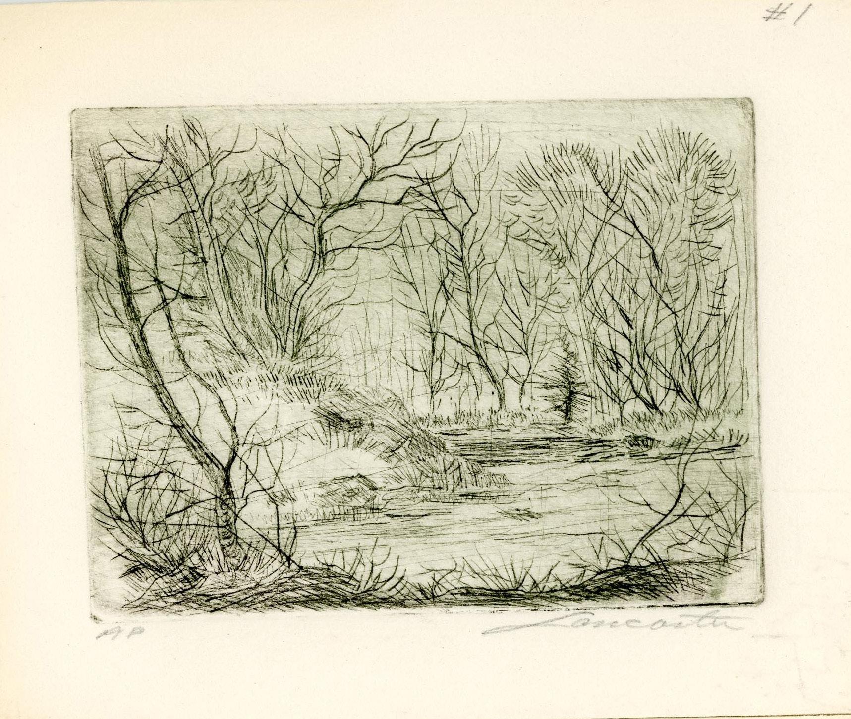 The Reece Museum holds seven artworks by Lancaster in our permanent collection: three etchings and four paintings. Each artwork is distinguishably made by Lancaster, and yet they each have a unique identity that seamlessly blends with other artworks in our collection. Several of our works include variations of a forest scene, but the techniques and color palettes employed by Lancaster subtly—or sometimes, drastically—vary from piece to piece.