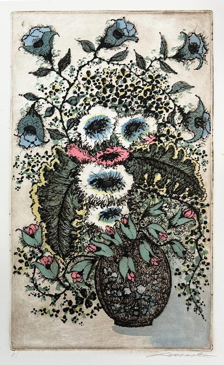 Floral Still Life, Pink & Red, undated 13.25 x 8”, hand colored etching