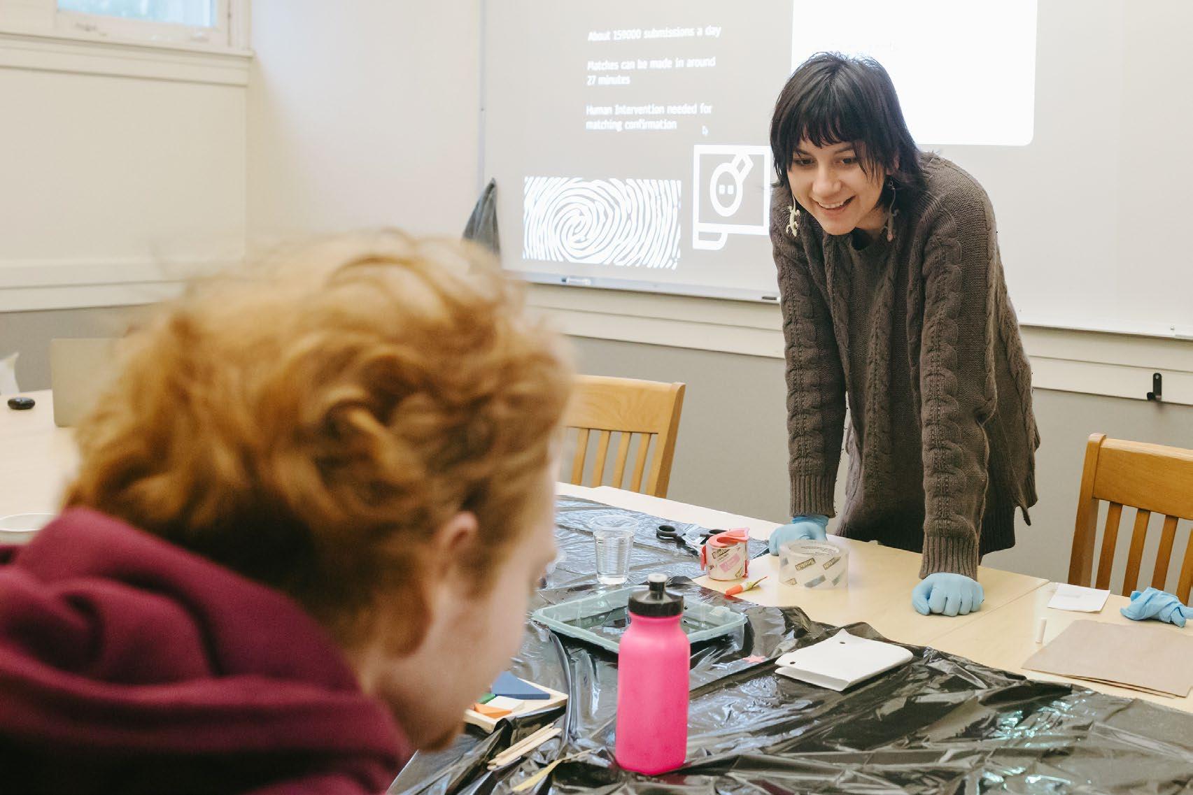 She was right. Student visits to the VRC multiplied over ten-fold. Van Stralendorff also partnered with Ann Matsushima Chiu, social sciences librarian and curator of the Reed Zine Library, to offer two risograph workshops led by Portland artist Timme Lu. At the first, held in November, a dozen students created collaborative collages and then inked them into vibrant pieces of art. Lu will return for another workshop in March—just a few days before the first Reed Zine Fest, a library-organized celebration of zines and other indie publications. Van Stralendorff collaborated with studio art faculty to incorporate the risograph into coursework, too. In the fall, students in Art Professor Daniel Duford’s Making Graphic Novels class and Professor Michael Stevenson Jr.’s Drawing in Many Forms class all undertook risograph work. “It’s a collaborative process between you and the machine,” says Charlotte Applebaum ’27, likening it to the experience of placing an unfired piece of pottery into a kiln. For each new color of ink the paper needs to be reloaded, which means the layers don’t line up perfectly. According to Stevenson, surrender is part of the lesson.