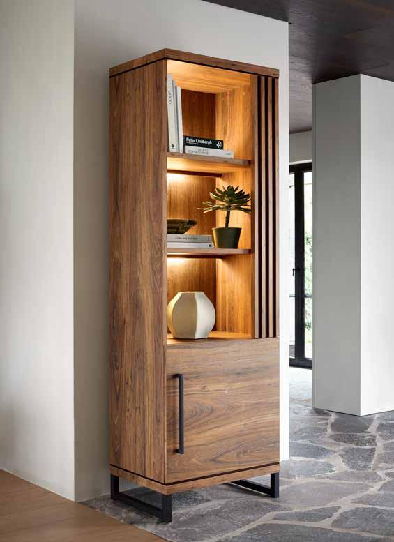 Kom naar de winkel en ontdek de voelbare houtstructuur van deze meubelserie in onderhoudsvriendelijk HPL kleur Sheesham. De kasten zijn leverbaar met of zonder LED-verlichting.
