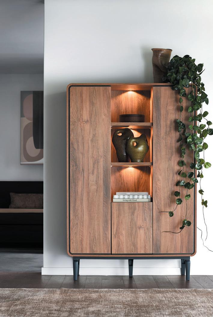 De diverse Lagoria kasten, uitgevoerd in Melamine, zijn verkrijgbaar in de kleuren Brushed walnut nature en Brushed sand oak nature en zijn mooi te combineren met eettafel Meberia.