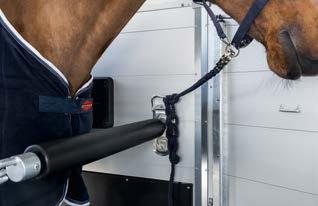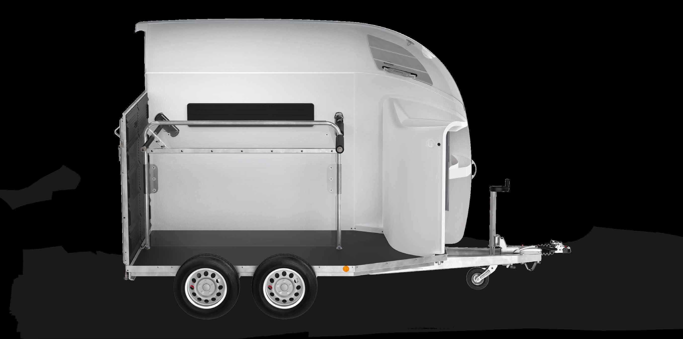 with practical shelves and plenty of storage space, accessible from inside and outside. In addition to the horizontally and vertically adjustable as well as pull-out saddle rack, a telescopic broom, plastic shovel, door net, mirror, riding crop holder, feed troughs, large bridle hooks, pad holder, LED light and folding stool with safety catch are also included in the standard equipment.