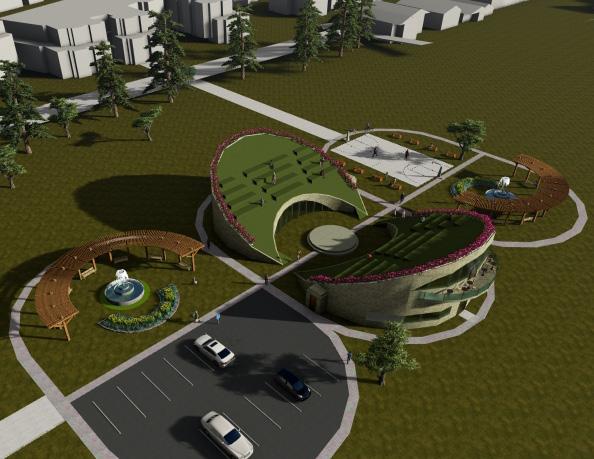 This library design embodies the themes of unity and stability, inspired by my painting of two arms held firmly together. The organic form features curved green roofs that blend seamlessly with the landscape, symbolizing connection to nature while providing functional outdoor spaces. Terraced seating on the slanted roof doubles as an open-air auditorium overlooking a central performance space, transforming the library into a dynamic hub for learning, reflection, and community gathering. The design ties architecture with nature, offering a grounded and inspiring space for all.