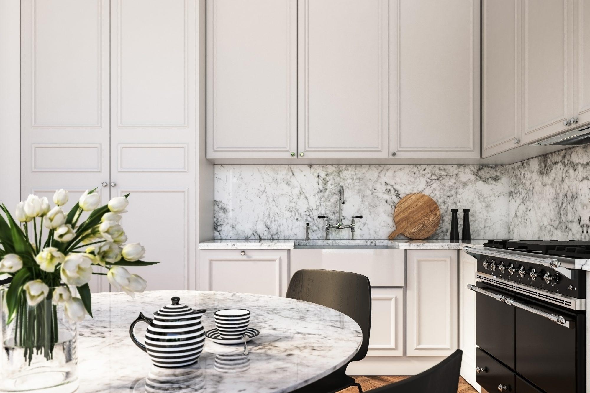 Well while we say that keeping the design minimalistic will look great but the fact is you can add some drama if you like! In your rather sleek and white kitchen, adding bright color cutlery or a chair or two will surely make the look a lot more dramatic. This will also become the instant point of attraction in your entire kitchen.