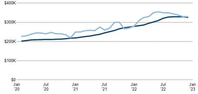ThischartcomparesaZIPcode'smedian estimatedhomevaluewiththemedian listingpriceofActivelistingsEstimated homevaluesaregeneratedbya valuationmodelandarenotformal appraisals