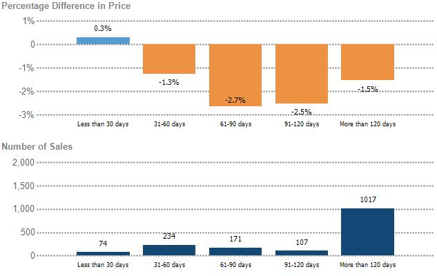 Thischartdisplaystheaverage percentagedifferencebetweenthe listingandsellingprice,comparedby lengthoftimepropertieswereforsale inthismarket.