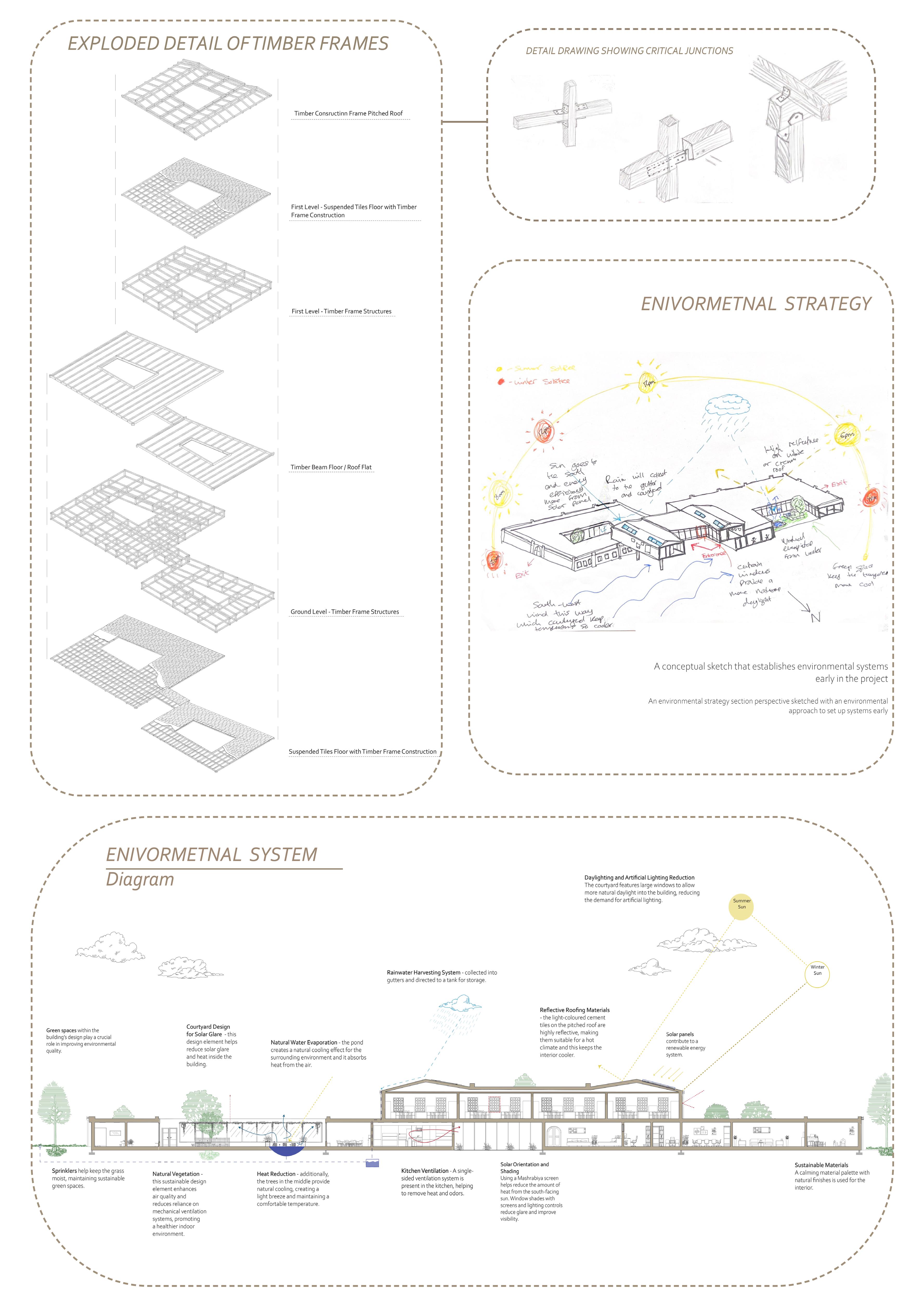 This section highlights the role of the courtyard in facilitating activities on both the ground floor and the first level of the building. It serves as a bridge between traditional and modern school designs, creating a relaxed environment that can help prevent poverty.