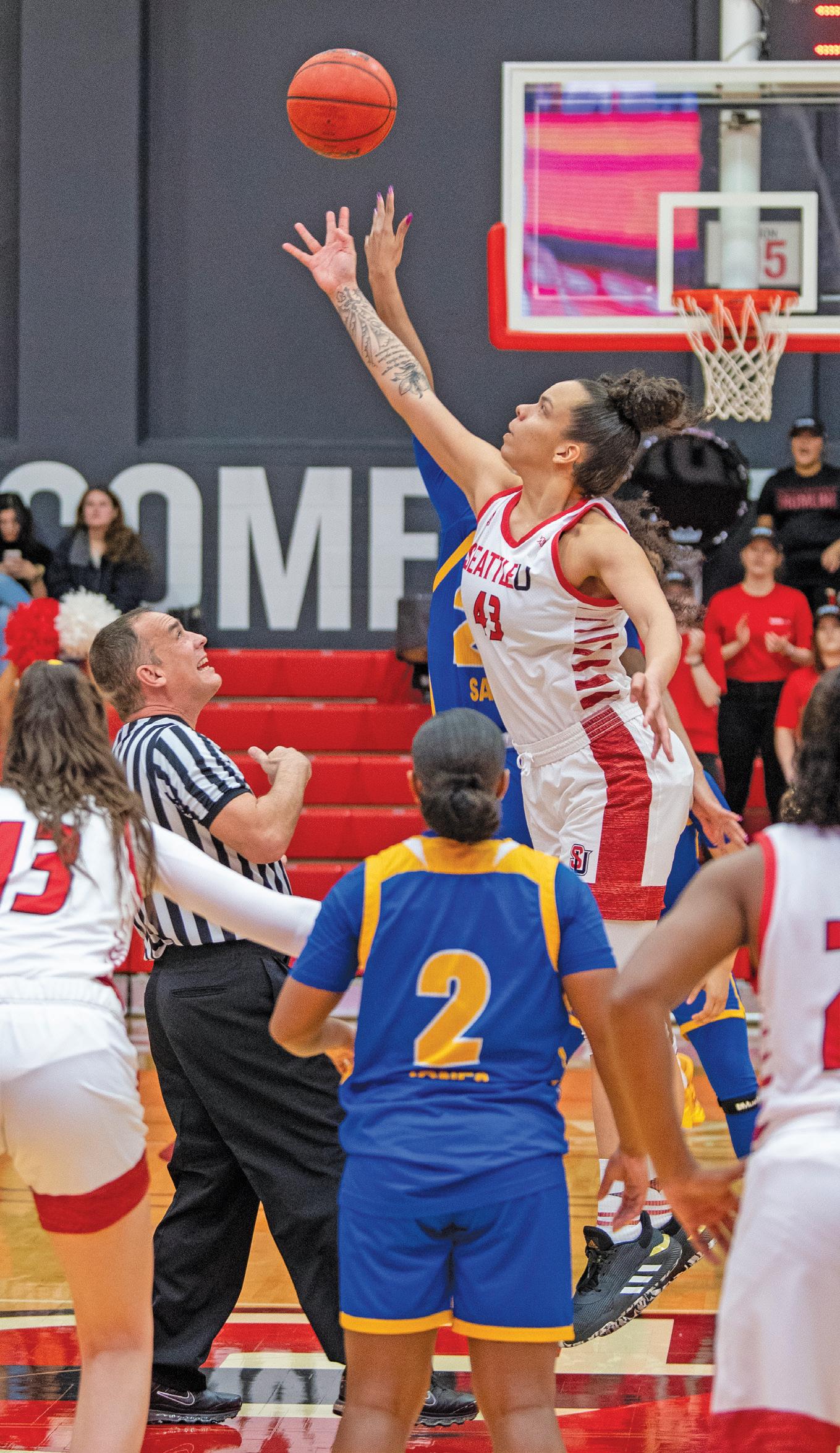 A lot can go wrong during the jump ball to start a game. While referee Chuck Gonzalez, Huntington Beach, Calif., must be aware of the jumpers’ actions, his partner(s) must pay attention to the remaining eight players to make sure they are not doing anything illegal.