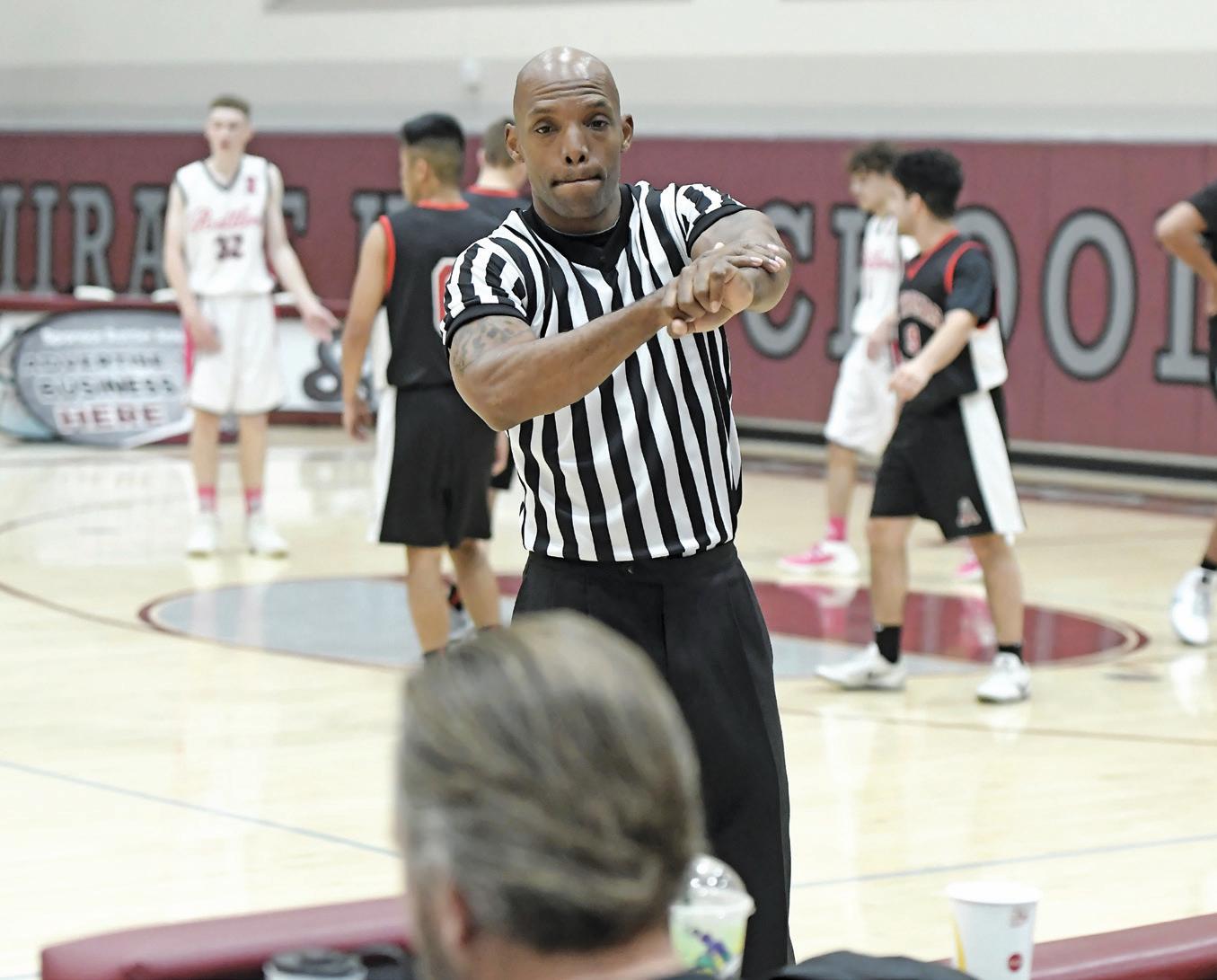 Clean, crisp signals delivered to the table from the proper location on the floor, as shown by Marcus Reed, Los Angeles, help ensure that the relationship between the game officials and the official scorer is a smooth one.