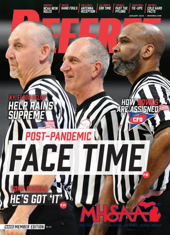 HAND FOULS TIE-UPS BASKETBALL PYLONS RECEPTION RULES FACTS your voice since 1976 $6.95 member edition KY. FLOOD RELIEF TONY PADILLA POST-PANDEMIC FACE TIME HOW BOWLS ARE ASSIGNED HE’S GOT ‘IT’ HELP RAINS SUPREME P.24 P.60 JANUARY 2023 // REFEREE.COM