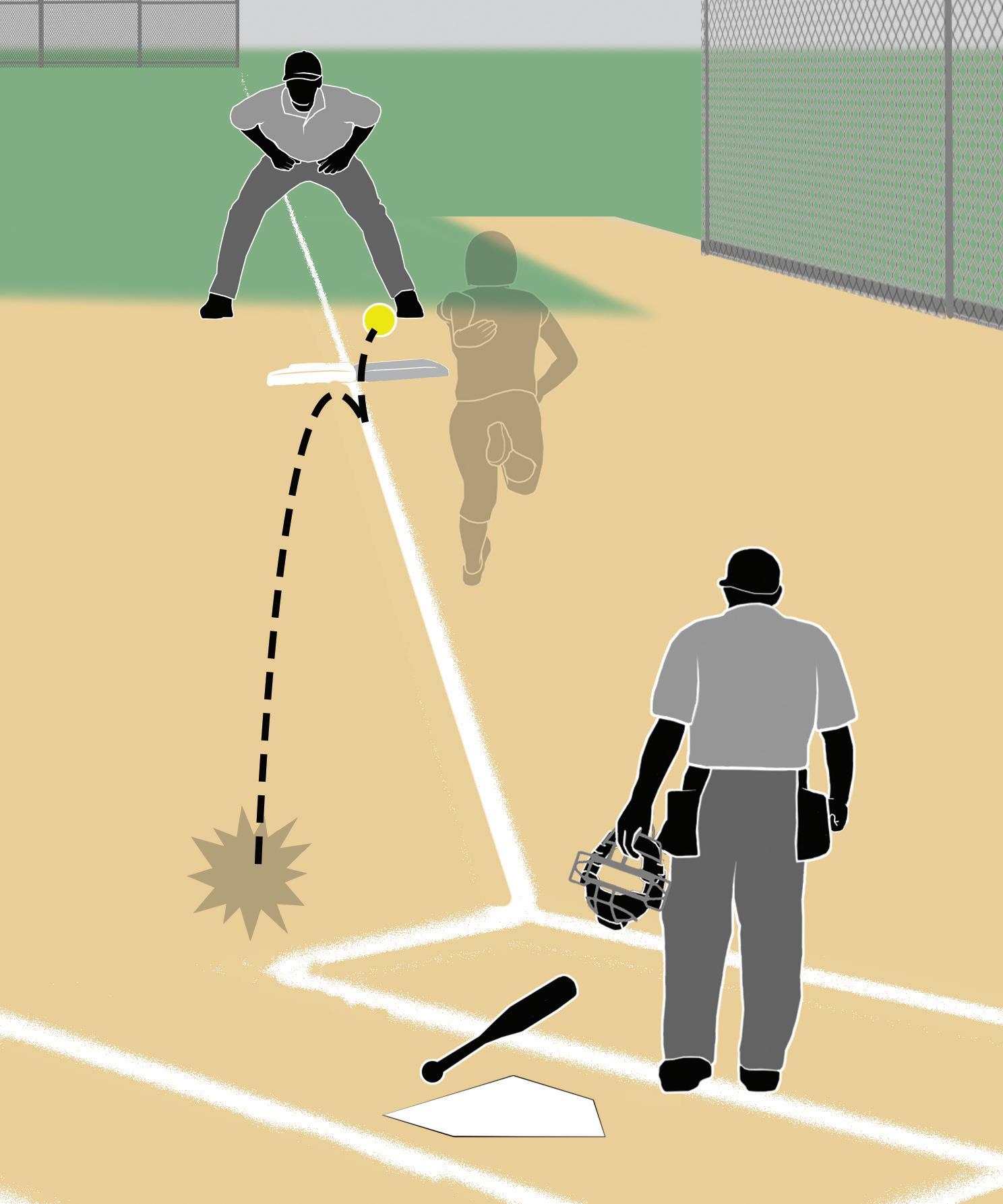 Play: With R3 on third and no outs, F5 is playing back at his normal depth, shaded toward F6. B2 hits a sharp line drive down the third-base line. R3 hustles back to the base. The ball strikes him over fair territory as he is crouched on the base and attempting to avoid being hit. F5 was not in position to field the ball. Ruling: The ball is dead and the runner is out. B2 is awarded first base. The base is not a sanctuary and