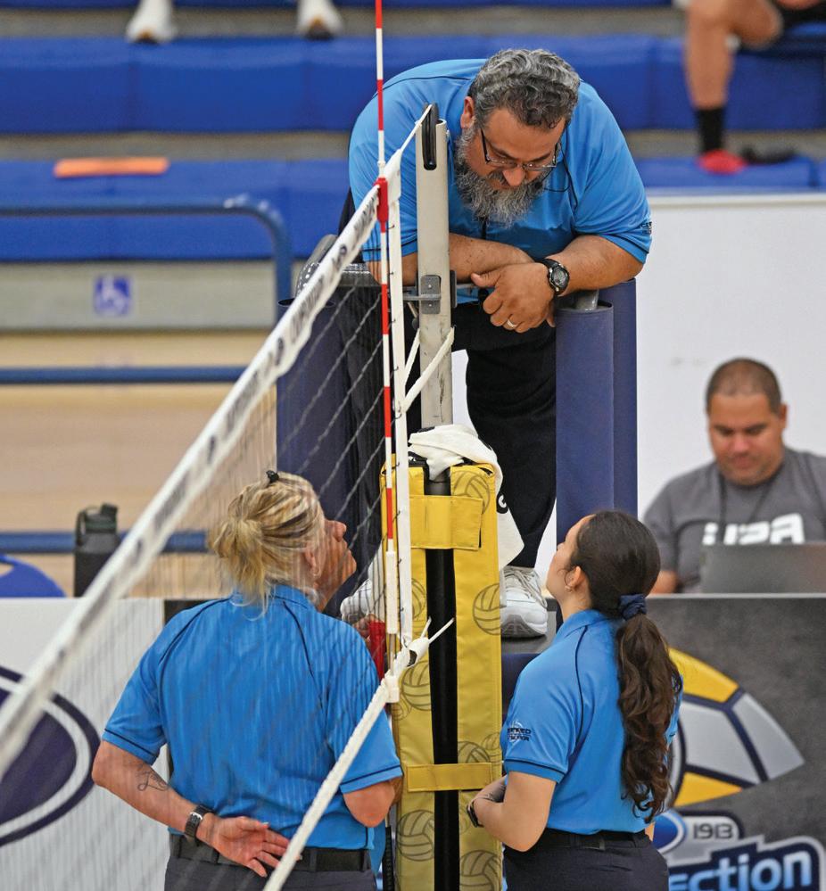Kelly Talsma, Bellflower, Calif., converses with the scorer to gauge her experience and also explain how things will be handled in the upcoming match.